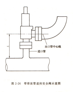 如图2-26所示,安全阀排放时,大量气体或蒸汽以音速或亚音速排出,给予阀门巨大的反作用力,对阀门与设备连接处产生很大的力矩。计算安全阀与设备连接部位的强度时,必须考虑到上述排气反作用力。