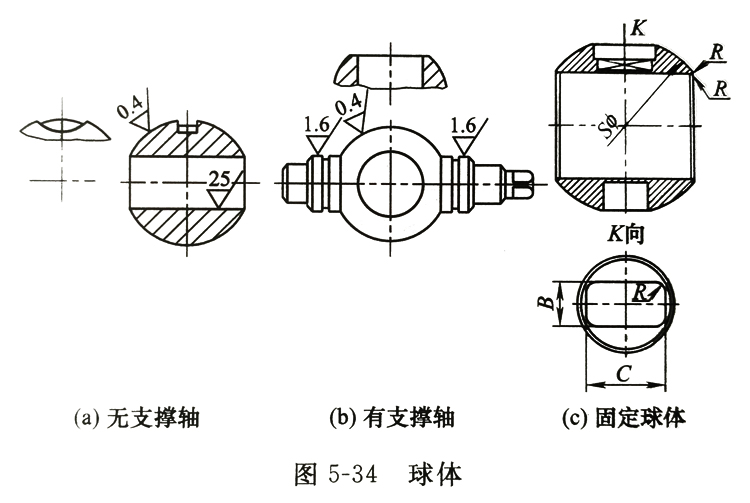 球阀的关闭件是球体。从结构上看,有带支撑轴和不带支撑轴的两种,如图5-34所示。两种球体中间都有通孔。根据球阀的用途,球体分别用铸铁、碳素钢、不锈钢及非金属材料制成。铸铁球体均采用铸件毛坯,钢制球体小尺寸的可用棒材直接加工,其余大部用锻件毛坯。