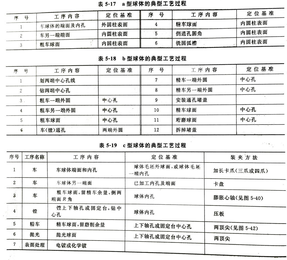 b型球体除球面外,还有精度较高的外圆柱面。这些加工表面可采用顶尖孔为定位基准进行加工。由于这种球体的通孔垂直于两端轴颈轴线,加工球面时有一定困难,所以在加工过程中须采取必要的措施,以保证质量。表5-17和表5-18为两种球体在中、小批量生产中的典型工艺过程。