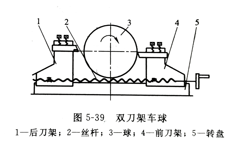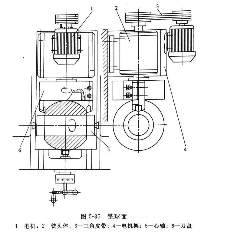 ①铣削法 图5-35是铣削球面的示意图。铣削法是在铣头前端装一个带两把车刀的刀盘,刀盘由电机通过三角皮带的带动而旋转。两刀的恨尖应在同一旋转平面内。旋转平面必须垂直于铣头的轴线,并与工件的旋转轴线平行,刀盘轴线应通过球心。两刀尖之间的距离可根据被加工球体的直径决定。