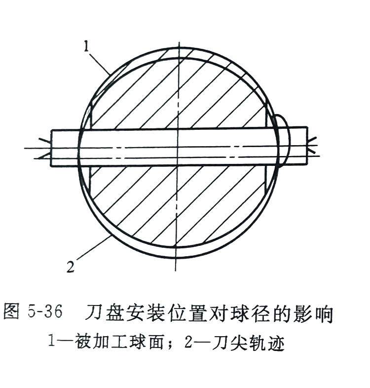 加工时刀盘轴线应垂直于球的回转轴线并通过球心。如果刀盘轴线高于或低于球的回转轴线,加工出的球体则呈椭圆形(图5-36)。由此可见,安装刀盘时应使刀盘轴线与球体轴线相交,否则将严重影响球体的几何形状精度。