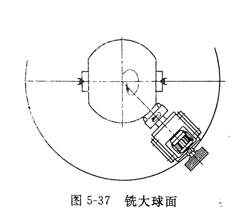 如将铣刀盘来代替车刀也能进行球面的铣削。如图5-37所示,这种方法同车球的原理相似,一般用于大直径球面的加工,其加工效率要比车削高。