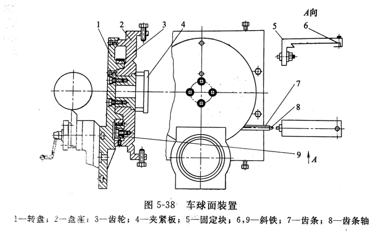 单件、小批生产多普通车床上加工球面。图5-38为车球面装置。该装置直接安装在麻身导轨上,并用夹紧固定。固定块装在纵溜板的燕尾导轨上,用斜铁将其紧固。以齿条轴将齿条连接在固定块上。当纵溜板纵向进给时,带动齿条作直线运动,从而使转盘作回运动,于是,安装在小刀夹上的车刀就可进行球面的车削。