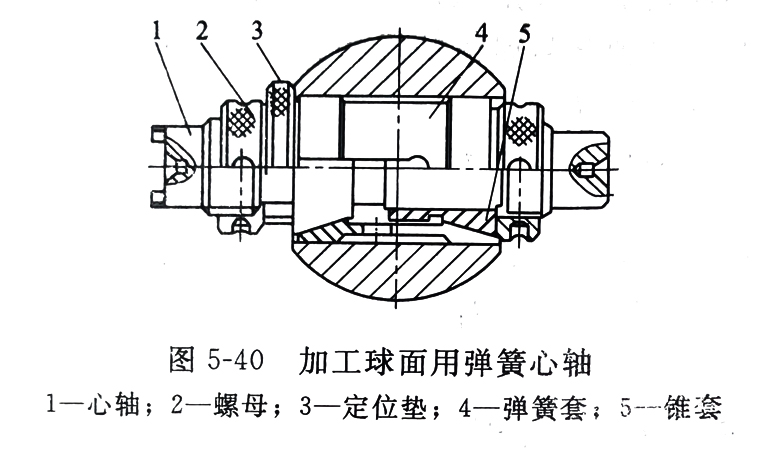 图5-40为加工球面用弹簧心轴。使用时将球坯套在心轴上,使其一端紧靠定位垫,拧动右端的螺母,把球体胀紧,然后松开另一端的螺母,取下定位垫。