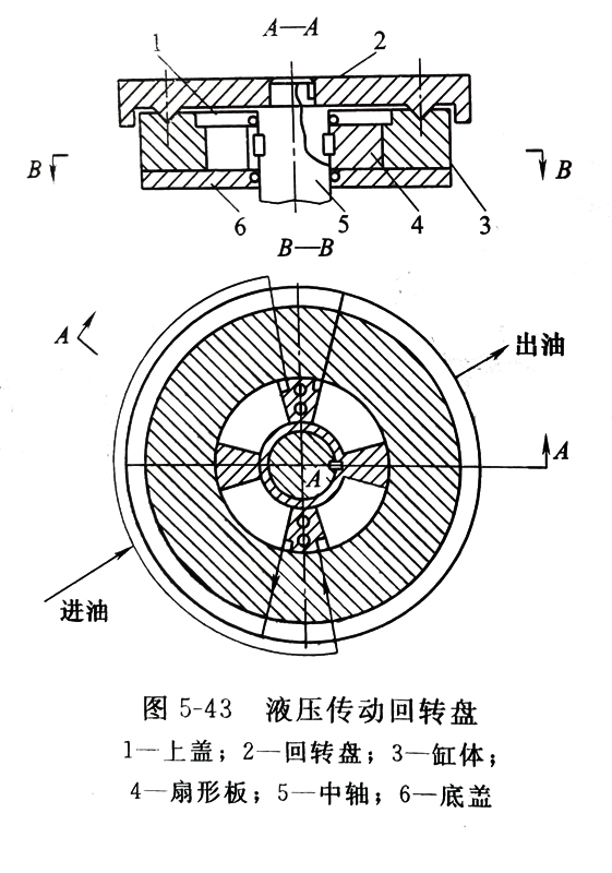 a用平表砂轮外圆磨削。如在普通车床上用砂轮外圆磨削,通常需将磨头安装在回转盘上,如图5-42所示。回转盘有机械传动的,也有液压传动的。图5-43为液压传动的回转盘。回转盘和扇形板用键固定在中轴上。压力油进入油缸,推动带回转盘的扇形板绕轴心逆时针转动。若改变压力油进入油缸的方向,则使转盘作反向旋转。压力油的流向由换向阀控制。调节压力油的流量媃中改变回转盘的转速。这种液压传动的回转盘,转动平稳,无噪声,适于球面的磨削与精车。也可以在专用机床上使用砂轮外圆磨削球面,但是必须把磨头安装在专用机床回转盘的刀架上。