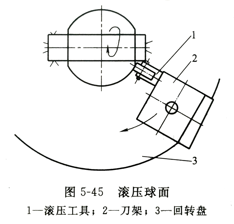 球面的滚压可在普通车床或专用球面车床上进行。滚压前可将滚压工具安装在回转盘上的刀夹,并使它处于右侧(图5-45),然后手动加压,使滚轮压紧球面,开始自动进给,即可进行滚压加工。