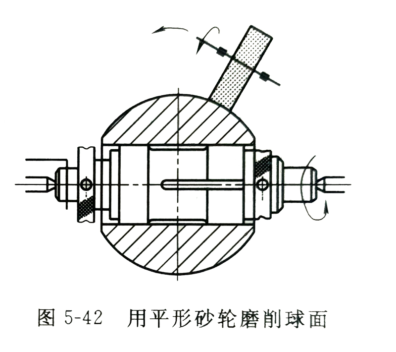 b.用碗形砂轮内侧磨削。用碗形砂轮内侧磨削的方法通常用于小直径的球面磨削。一般用于球径小于100mm的球面。磨削时可将磨头安装在普通车床的中溜板上,或安装在专用机床上。磨削时,碗形砂轮的轴线必须通过球心。如果砂轮轴线不通过球心,磨出的球面将呈椭球形。图5-44为用碗形砂轮磨削球面的情形。